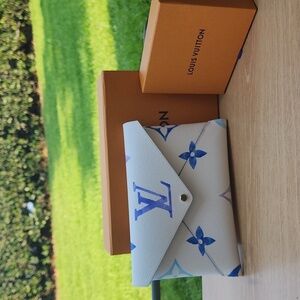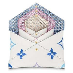 For the seasonal Resort collection, the Kirigami Pochette comes in coated canvas printed with an oversized Monogram pattern. Each of the three envelopes features a different palette of summery shades and a coordinating leather lining with a pattern of Monogram Flowers. The largest pouch can hold a tablet, the medium one a passport, and the small one cards.