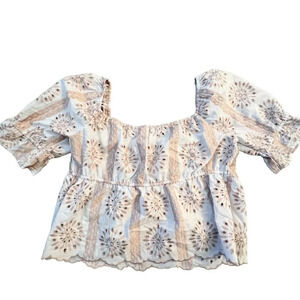 Excellent used condition women’s Kirious Embroidered Eyelet Blouse in rose color. Puff sleeves, sweetheart neckline, and tie at neckline.