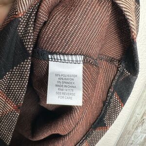 Kirious stylish plaid skirt featuring a classic black and brown pattern. Size small. Front pockets. Stretchy. Great coverage. Pair with a sweater, bodysuit or crop top. Perfect for any occasion. Preowned, like new. No flaws.
