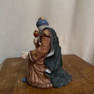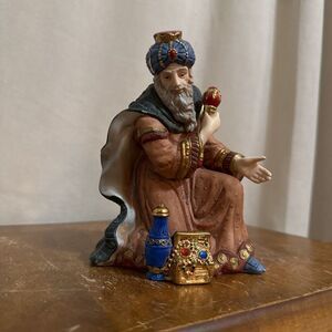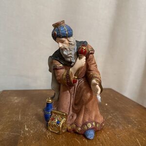 The Kirkland Signature Nativity Kneeling Wiseman King Magi is a large porcelain figurine standing at 6 1/2 inches tall and 5 inches wide. This multicolor figurine represents one of the Wiseman Kings, making it a perfect addition to a Christmas nativity set. It is a high-quality piece from the Kirkland Signature brand, designed as a replacement for set #75177, and is suitable for display during the holiday season.