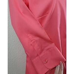 pink orange, button up, pointed collar, 3/4 cuffed sleeves, lightweight, soft, round hem