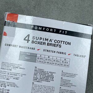 4-pack Supima cotton boxer briefs with stretch fabric and comfort waistband. Medium size fits 32-34 inches. Tagless design for irritation-free wear. Made in India.