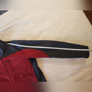 This soft shell men's jacket from Kirkland Signature features several pockets and a dark red and grey color black design. In good pre-owned condition, this jacket has a small, barely visible stain that i attempted to picture. This coat is a men's size Large.