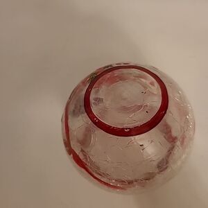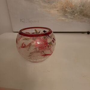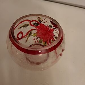 Pre-owned in good used condition. Poinsettia bowl with red ribbons and a bird.The bowl is approximately 3 inches high and the diameter with a diameter of approximately 3 inches and a glittery texture.
