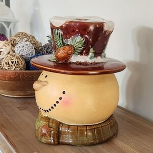 Charming kirklands ceramic snowman cookie jar, 9.5 inches tall and approx 7.5 inches wide st the hat. preowned, in excellent cond I tion. no chips or cracks. the box shiwsnsigns of wear but the Styrofoam packing inside is sturdy. warm, rich, unique look. another awesome creation from kirklands.