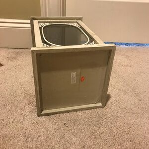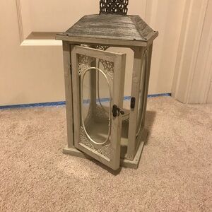 Lantern was purchased from Kirkland’s. Made of wood and metal materials. Rustic farmhouse style. Door opens to place candles inside. Good condition. Approx 18” H x 8” W x 8” D.