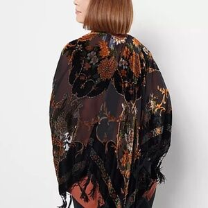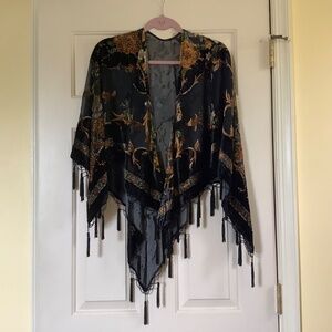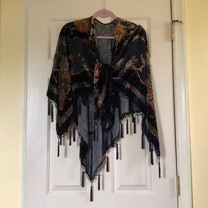 A lush floral hand beaded design plus sweeping tassel details give this garden of black mist wrap poncho an air of opulence.