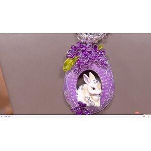 Egg shape accented with flowers with white bunny in center; enamel and stones.