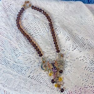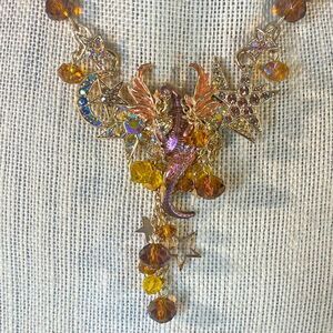 Kirks Folly beaded necklace. This necklace is stunning. It has a dragon as the center piece with moons and stars around. It has a brownish colored bead with gold tones. Like new! This is definitely a unique statement piece!
