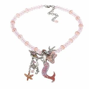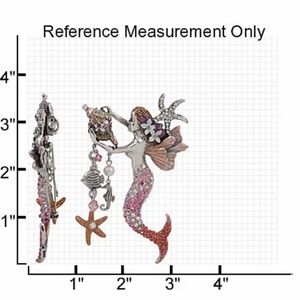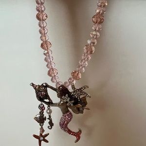 Kirks Folly mermaid pin/enhancer is a reminder of the magical beauty the ocean holds. Mermaid pin/enhancer has epoxy enamel details on wings, hair, seashell, and starfish; tail encrusted with pink it has a hidden snap hinge bail and a pin. Necklace is made of multi-faceted beads in alternating shades of blush pink and sheer peach. Necklace secures with a lobster claw clasp. Approximate measurements: Pin/enhancer 3-5/8"L x 2-1/8"W; Necklace 17"L x 3/8"W plus a 3"L extender. This is a Kirks Folly Collectors piece.