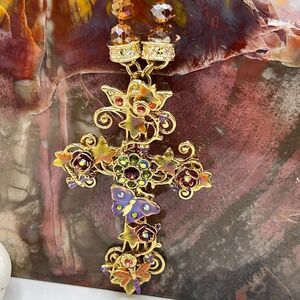 Antiqued silvertone: large cross with intricate designs of leaves, vines, flowers, dragonflies, and butterflies in epoxy enamel colors; purple aurora borealis crystal accents; hidden bail; flower design stations on chain