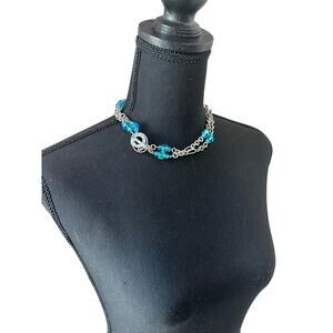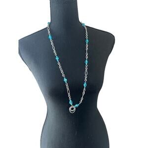 Double chain configuration. Necklace is 26" long and closes with a toggle clasp which has Aurora Borealis crystals on it. You can wear with clasp at the bottom or behind your neck. When closed necklace measures just under 16" from one end to end of enhancer. You can add charms to this.