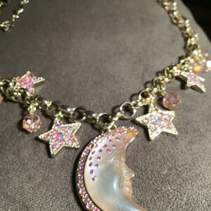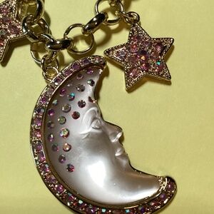 Kirks Folly necklace with half moon face enhancer, charm, pendent. Gold tone metal with half moon face and Aurora borealis crystals, chain has dangling stars with the same crystals and peachy pink dangling beads.NWOT. Ships in a white jewelry box.