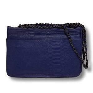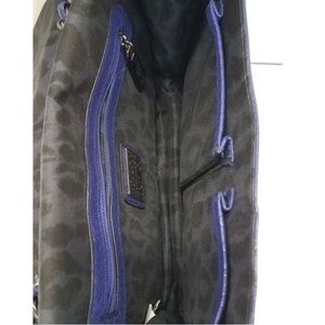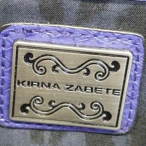 Kirna Zabete pretty exotic print in a pretty purple color with black hardware. Snap closure, three interior pockets, one zipper pocket. Bag can be a crossbody or adjusted for a shoulder bag. (2 way)