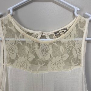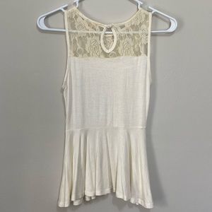 Kirra Cream peplum with lace insert around the neckline. Soft knit material.There is some slight discoloration on the button. See picture to see the discoloration. Size XSmall