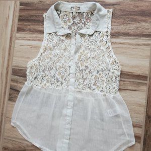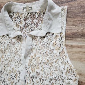 Kirra - Sheer, chiffon and lace, gold and white sleeveless button down blouse. Lovely and lightweight. Keep cool in the upcoming months with a cute, complimentary bralette and cuffed shorts (: