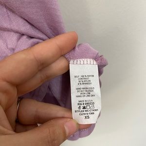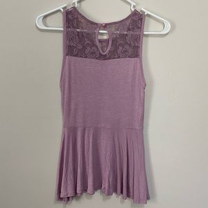 Kirra lavender purple peplum with lace insert around the neckline. Soft knit material. Size XSmall