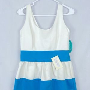 Kirribilla Lucy Dress. Blue and white. The blue in the actual dress is lighter than the pictures. I could not capture it in my pictures. Size 8. New with tags. No stains. Cotton/silk blend. Hidden side zipper. The back has a bow. Fully lined. Armpit to pit measures approximately 16.5 inches. Top of shoulder down measures approximately 35 inches. Comes from a smoke free home.