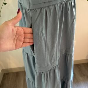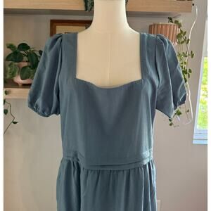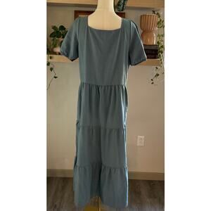 Lagenlook Blue Square Neck Puff Sleeve Tiered Maxi Dress w/ Pockets Size Medium Lang