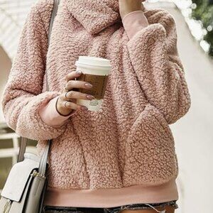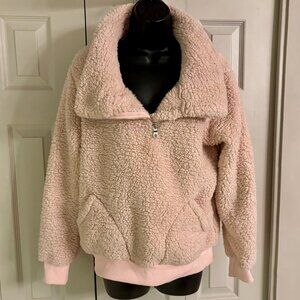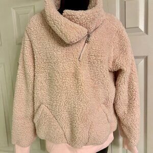 Barely worn. This luxuriously soft Kirundo sherpa pullover in a beautiful blush pink shade features a stylish quarter-zip design with a fashionable lapel collar. The plush 100% polyester teddy fabric provides ultimate warmth and comfort, while the front kangaroo pockets add practical functionality. The ribbed cuffs and hem create a flattering silhouette. This medium-sized pullover is in good condition with minimal wear, perfect for casual winter styling or cozy lounging. The versatile design can be dressed up or down, making it an essential addition to any cold-weather wardrobe
