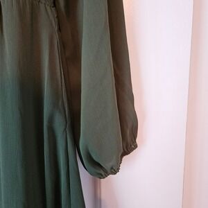 Olive green long-sleeve maxi dress with lace ribbon accents and stretchy smocked top.