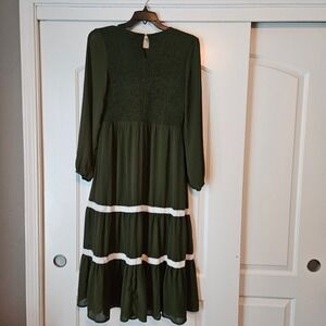 Keywords: maxi dress, long sleeve dress, tiered dress, boho dress, smocked dress, olive green dress, casual dress, women's dress, lined dress, bohemian dress, Kirundo dress, lace trim, flowy dress