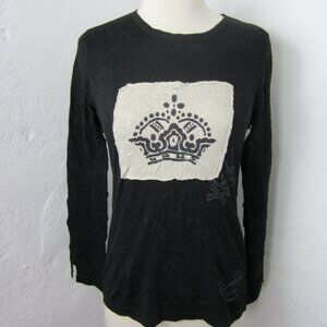 Kisca by Komarov Top Women's Size M Black Graphic Crown Patchwork Crinkled Long Sleeve