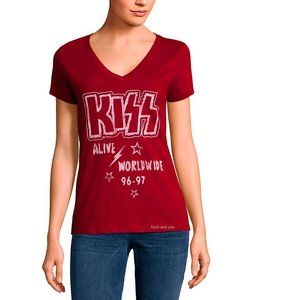 Burgundy V-neck tee from KISS with Alive Worldwide 96-97 inspired logo design on front. Crew neck. Show your passion for KISS with this sleeveless T-shirt. Made in USA! 60% Cotton, 40% Polyester.