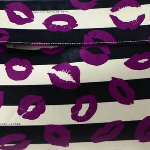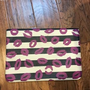 Cute lip design bag for laptop, carry all or whatever. Measures approximately 13 1/2 inches wide and 9 1/2 inches tall. Has a flap closure with a magnetic closure. Has smudge on back.