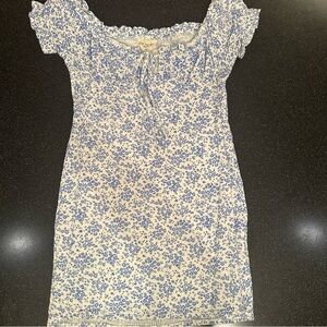 Charming off-shoulder ruched mini dress with blue and white floral pattern.