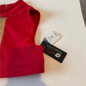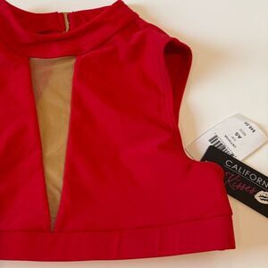 Vibrant red bikini top with mesh cutout. Stylish and fun for swimming.