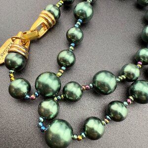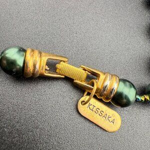 This Kissaka necklace features lustrous green faux pearls and iridescent glass beads, complemented by a gold-tone clasp. Stylishly designed for everyday elegance and versatility.