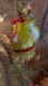 Girl has red bow, red lips, tutu and holds gift box with bow behind her back