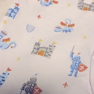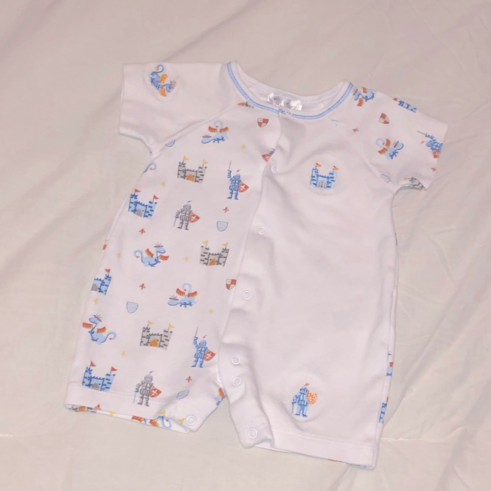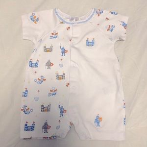 Knight in shining armor with dragons! Adorable knights, dragons, and castles print boys romper from Kissy, Kissy.