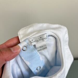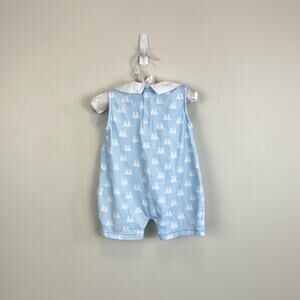 Kissy Kissy Blue Bunny Rabbit Pima Cotton Shortie. Baby boy size 9 months. Adorable blue one piece romper outfit with white bib collar. So cute and so cozy! Perfect for Easter and all spring long!