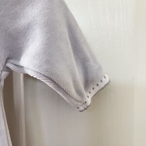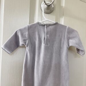 Kissy Kissy Gray Velvet Footie One Piece Crochet Lace Trim Size 0-3 Months. Adorable little one piece footie. Crochet lace trim along the chest and wrists. Back and leg snaps. Has been worn and washed and there are some marks/indents in the velvet as well as a hole that was caused by a tag barb, I mended the hole, but it isn't the best and it damaged the neck trim a bit as well. Please see the pictures. Still has a ton of life left, but is far from perfect.