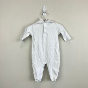 Kissy Kissy Winter Solstice Footie with Collar. Baby boy or girl size 0-3 months. Brand new with tag (NWT). Simple, yet elegant one piece footed coverall outfit. Bright with with crochet detail on the feet. Peter pan collar. Buttons in the back and along the legs.