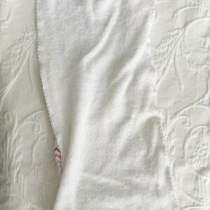 Good used condition. There is slight discoloration on the white terry Cloth side, but very hard to see unless you really look close.