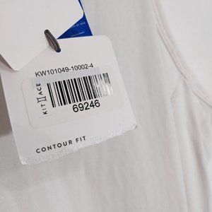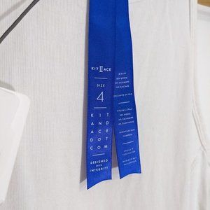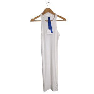 Kit and Ace Sleeveless Tee Dress in white. Size US 4. Dress features crew neckline and a logo on the side. Dress has some sheer to it. Dress is made of modal, cashmere, and elastane. Dress is new with tags. There is a small hole on the back by the neckline (see last picture).