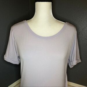 Very soft and drapes on the left side. The sleeves are sewn rolled up to give it a muscle shirt vibe. Crew neck.
