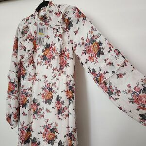 Chic floral dress with long sleeves. Features a beautiful floral pattern on a off-white background.