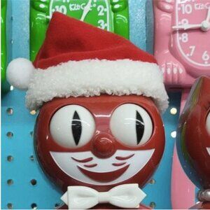 Add a festive touch to your full-size Kit-Cat Klock with this exclusive holiday accessory set. This listing includes a red Santa hat and a green and white striped knit scarf—both designed to fit standard-size Kit-Cat Klocks.