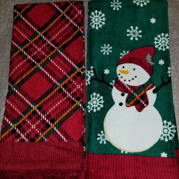 Cannon 100% cotton Holiday Kitchen 2 Towels: green with snowflakes and snowman; red plaid, each towel is 15x25"