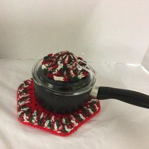 Christmas colors Red, White, Green Hand Crochet Warming Pad Pot Holder and Pot Top/Lid Grabber for your Pot Lids. New. Cute Set includes both. Pot top In shape of little hat with ribbon. Hat measures approximately 4” in in diameter with approximately 2” in inside fit on pot lid. Ribbon can be pulled to tighten or loosen. Double thickness Pot holder Worsted weight yarn. Great unique house warming gift. See photos for details and approximate. Comes from a smoke free and pet free home. Thanks