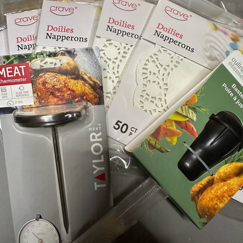 Unique bundle just for you. Includes 5 paper doilies. Each packet consists of 50. 1 meat thermometer and 1 turkey baster with brush all new still in original packaging.