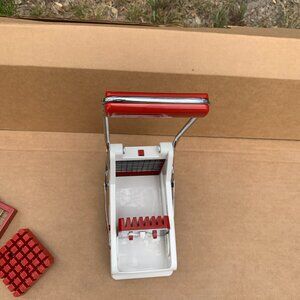 This listing is for possibly new but listing as pre-owned since I am not sure. Norpro vegetable or fruit slicer/cutter with stainless steel blades, plastic, easy grip handle, plastic body with 2 different cutters perfect for fries, 36 sq & 64 sq. Colors may vary some due to camera settings and lighting.