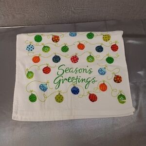 Up for sale is a Christmas hand towel. It features the words Season's Greetings along with several strung together ornaments in a multitude of colors. It is soft and I think it is made of cotton and polyester. It measures about 23 inches long by 15 inches wide. I'll be listing several other Christmas hand towels shortly if you'd like to take a look. Thanks for looking!