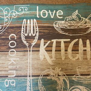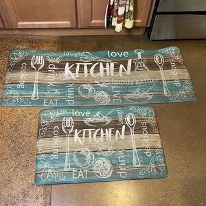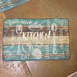 Teal, tan, brown and cream colored thick foam kitchen mats. Works and kitchen designs all over the mats. Like new! Measurements in photos!