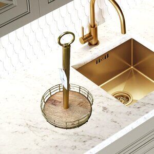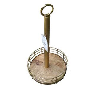 This stylish metal and wood paper towel holder with basket base has a stately gold basket finish.