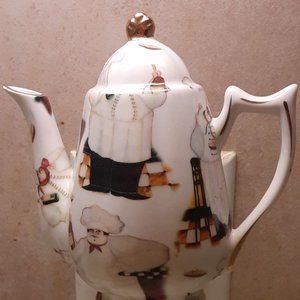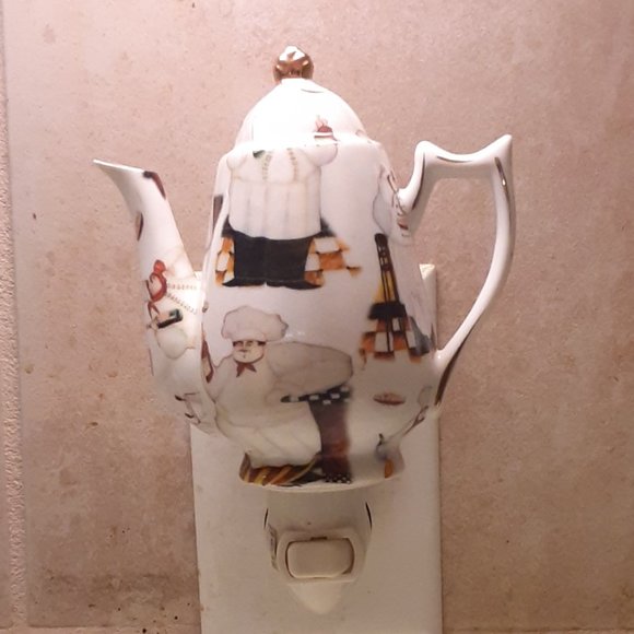 Perfect night light for your kitchen in the shape of a small tea kettle. Features chefs holding wine and other images (see pics). Light bulb not included.